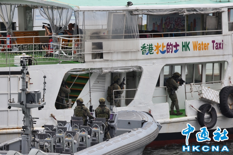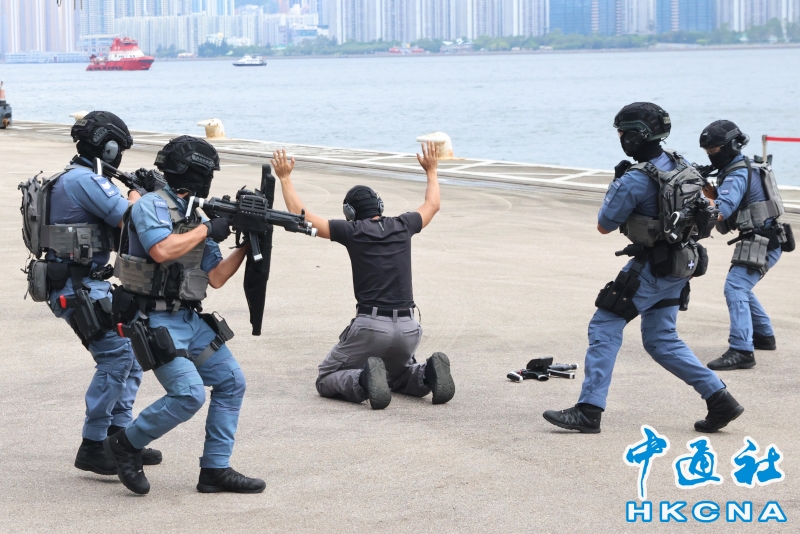 8月28日,香港跨部門反恐專責組在啟德郵輪碼頭進行代號“勇光”的跨部門反恐演習。圖為演習模擬有多名極端分子在郵輪碼頭發動恐怖襲擊,警方衝鋒隊、反恐特勤隊衝入碼頭,在激烈槍戰後將他們制服。(香港中通社記者 謝光磊 攝) 香港中通社圖片