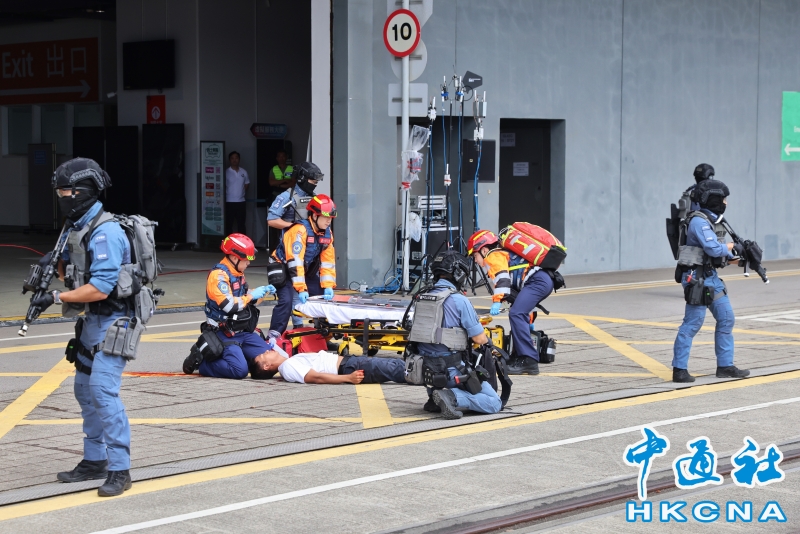 8月28日,香港跨部門反恐專責組在啟德郵輪碼頭進行代號“勇光”的跨部門反恐演習。圖為演習模擬反恐特勤隊人員護送消防處“特別支援隊”救護人員到現場,救助嚴重傷者離開。(香港中通社記者 謝光磊 攝) 香港中通社圖片