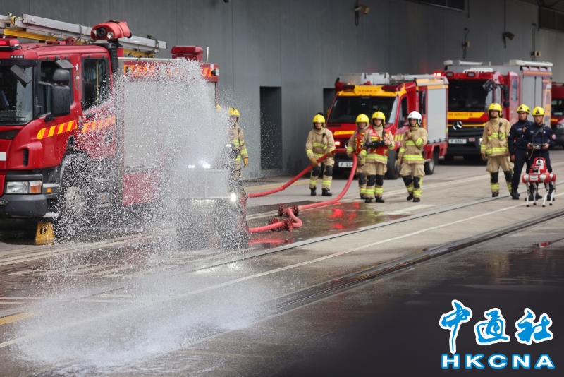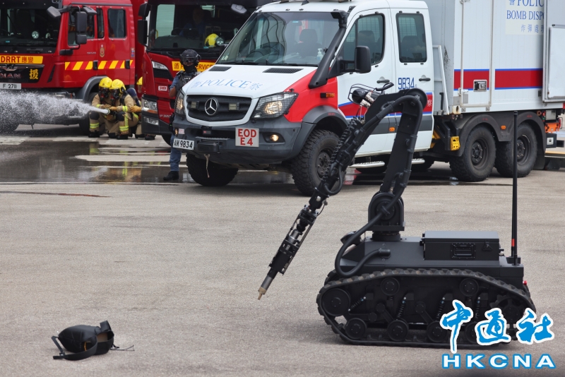 8月28日,香港跨部門反恐專責組在啟德郵輪碼頭進行代號“勇光”的跨部門反恐演習。圖為演習模擬警方在現場地下發現一個電線外露的黑色背囊,懷疑裏面藏有爆炸品。消防處增派機械狗及滅火機械人到場支援。消防人員在安全距離內遙距控制滅火機械人戒備,隨時在有需要時進行滅火工作,確保前線人員安全。(香港中通社記者 謝光磊 攝) 香港中通社圖片