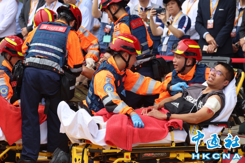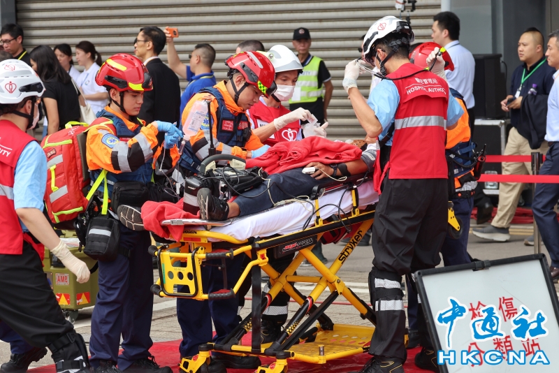 8月28日,香港跨部門反恐專責組在啟德郵輪碼頭進行代號“勇光”的跨部門反恐演習。圖為演習模擬消防處接報後派出多架救護車及流動傷者治療車到場救助現場傷者。(香港中通社記者 謝光磊 攝) 香港中通社圖片