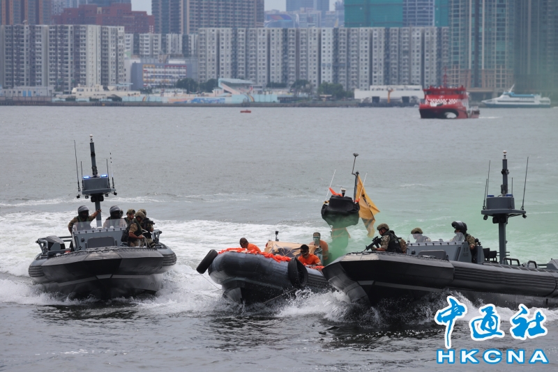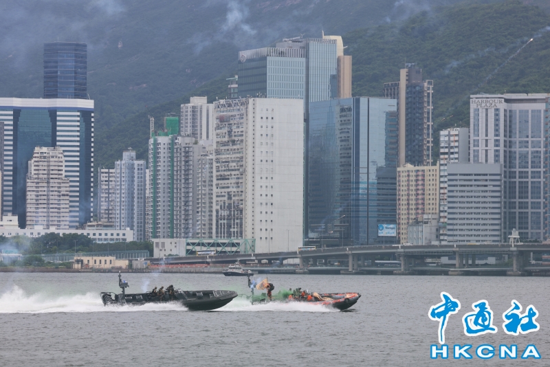 8月28日,香港跨部門反恐專責組在啟德郵輪碼頭進行代號“勇光”的跨部門反恐演習。圖為演習模擬警務處小艇分區出動兩艘高速追截艇追截目標快艇,採用“二對一 ”戰術隊型,有利於水警人員在高速追截期間互相支援,限制疑船移動範圍,再將目標帶入可控水域,以降低碰撞及擱淺風險。(香港中通社記者 謝光磊 攝) 香港中通社圖片