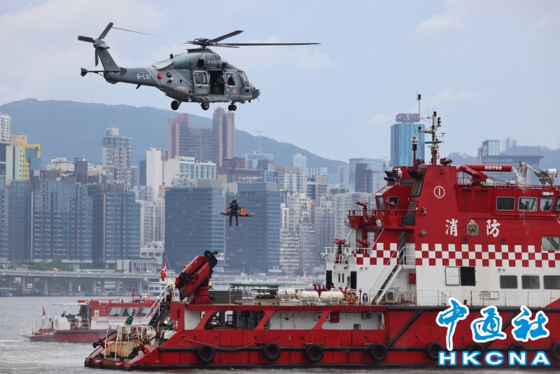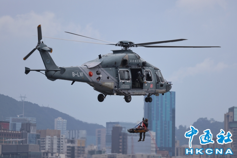 8月28日,香港跨部門反恐專責組在啟德郵輪碼頭進行代號“勇光”的跨部門反恐演習。圖為演習模擬消防處召喚政府飛行服務隊直升機到場協助運送傷員。(香港中通社記者 謝光磊 攝) 香港中通社圖片