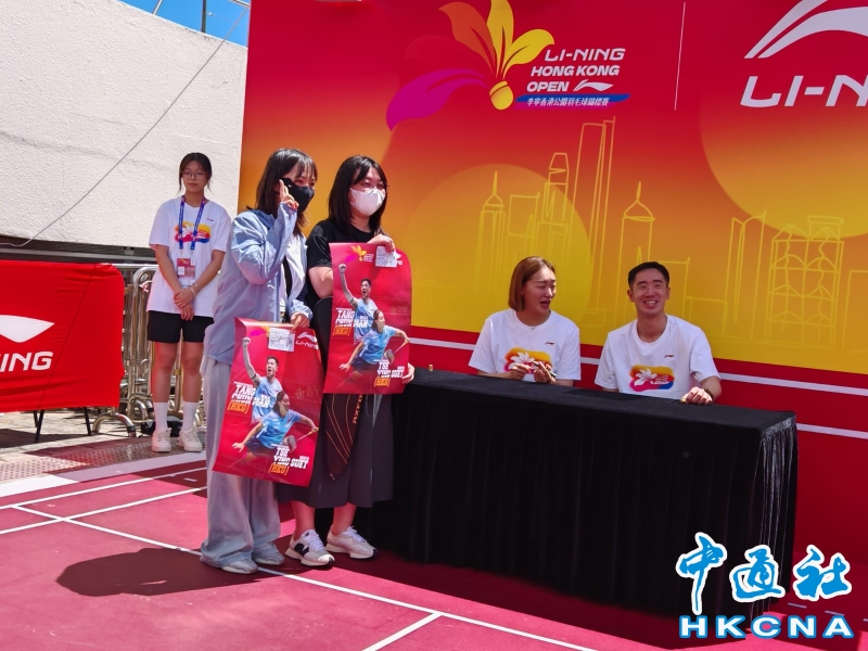 •   9月14日,球迷與香港羽毛球隊混雙選手鄧俊文(右)、謝影雪(右二)合影。當天“李寧二零二五香港公開羽毛球錦標賽 匯豐世界羽聯世界巡回賽超級500”落幕,大批球迷進場觀看決賽。“李寧二零二五香港公開羽毛球錦標賽 匯豐世界羽聯世界巡回賽超級500”於9月9日至14日在紅磡香港體育館舉行。(洪紫萱攝) 香港中通社圖片