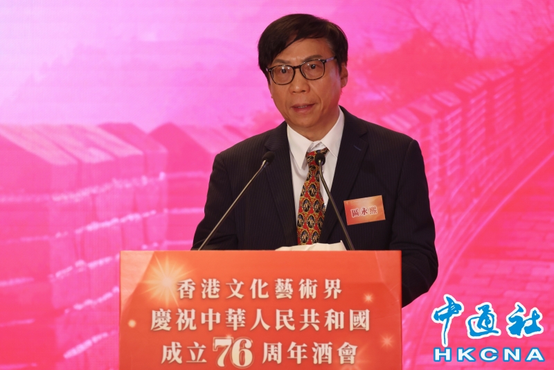 •   10月9日,香港文化藝術界慶祝中華人民共和國成立76周年酒會在香港舉行。一眾本地文化藝術界精英及業界友好聚首一堂,同賀國慶,並共同紀念抗戰勝利80周年。活動由香港文化藝術界慶祝中華人民共和國國慶籌委會舉辦。圖為籌委會聯席主席兼榮譽贊助人區永熙致辭。(香港中通社記者  謝光磊 攝) 香港中通社圖片