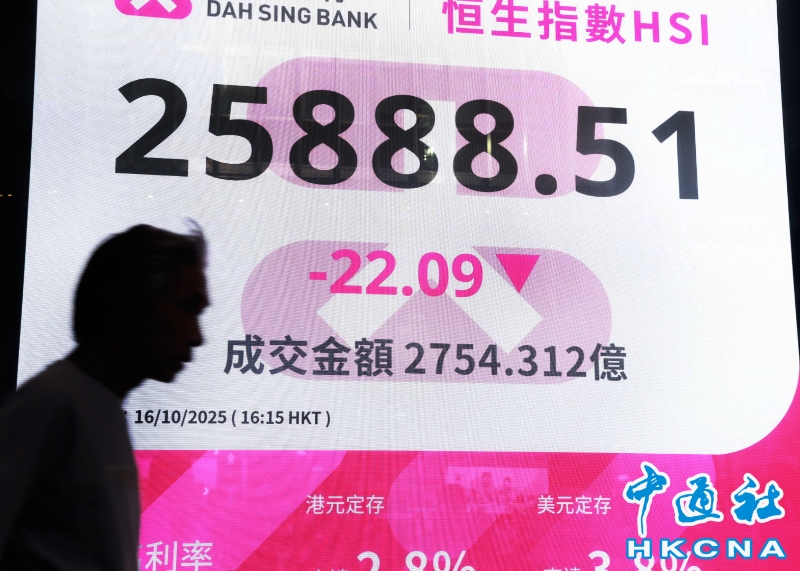 •   10月16日,截止收盤,香港恒生指數跌22.09點,跌幅0.09%,報25888.61點,主板全天成交2754.31億港元。(香港中通社 鄧梓傑攝) 香港中通社圖片