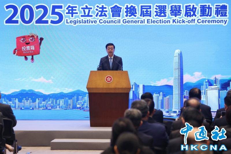 •   10月23日,香港特區政府和選舉管理委員會舉行2025年立法會換屆選舉啟動禮。圖為香港特區行政長官李家超在啟動禮上致辭。(香港中通社記者  謝光磊 攝) 香港中通社圖片