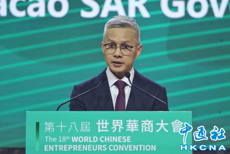 •   11月2日,由澳門中華總商會主辦的第十八屆世界華商大會舉行歡迎晚宴。本屆大會主題為“共商共築華商命運共同體”,旨在強調全球華商團結互助、共同發展的重要理念。圖為澳門特別行政區政府經濟財政司司長戴建業在歡迎晚宴上致辭。(香港中通社記者  謝光磊 攝) 香港中通社圖片