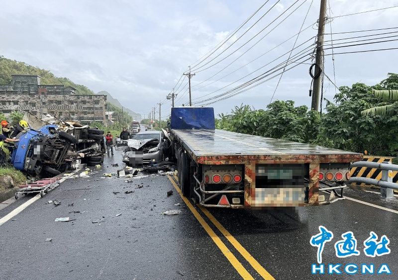 •   11月12日,一輛大型拖板車行經台灣花蓮台11線豐濱路段時,疑因過彎打滑,車尾滑到對向車道,一輛剛好行至該處的貨車緊急煞車避讓,卻遭後方趕至的小客車撞翻,貨車司機當場死亡,車禍原因尚待警方調查。 香港中通社圖片
