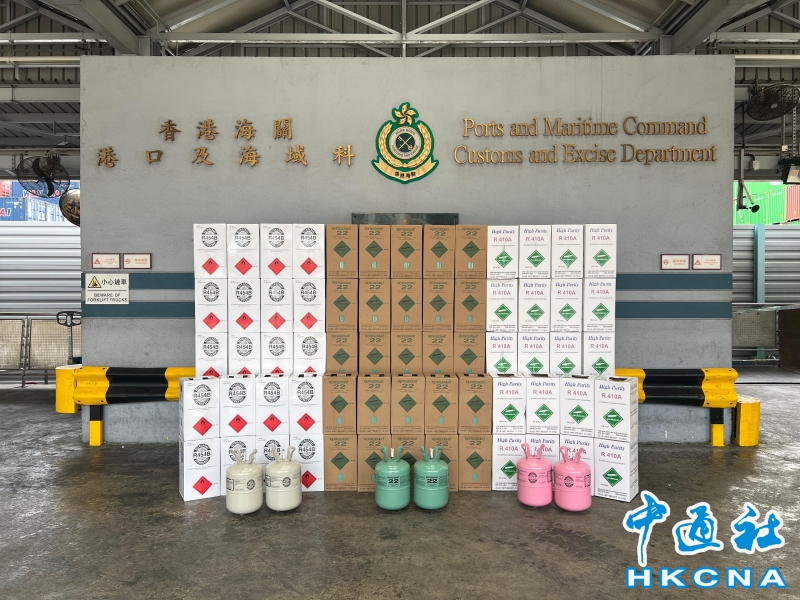 •   11月24日,香港海關與環境保護署公佈11月20日在葵涌採取聯合行動,檢獲約一千三百罐懷疑走私雪種,估計市值約六百四十萬元。圖為檢獲的懷疑走私雪種。 香港中通社圖片