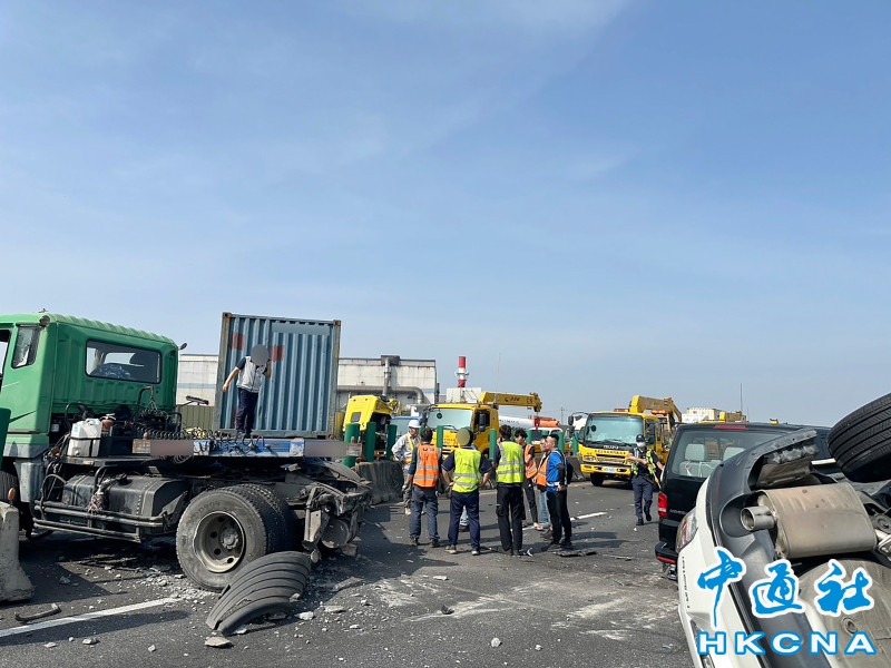 •   11月25日,台灣一輛半聯結車行駛至第一高速公路南向343公里處,為了閃避一輛車,先撞到一輛半聯結車,再撞擊分隔線護欄,衝向北上車道,2部迎面而至的車輛煞車不及撞上失事半連結車,車禍造成13名民眾受傷送醫。 香港中通社圖片