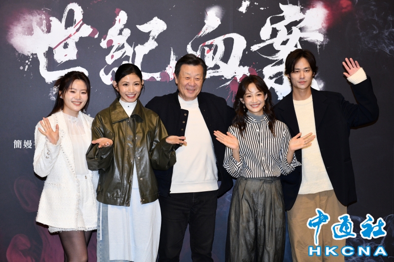 •   2月1日,台灣電影《世紀血案》舉行殺青記者會,演員(左起)楊小黎、李千娜、寇世勳、簡嫚書、夏騰宏出席分亨拍攝心情。 香港中通社圖片
