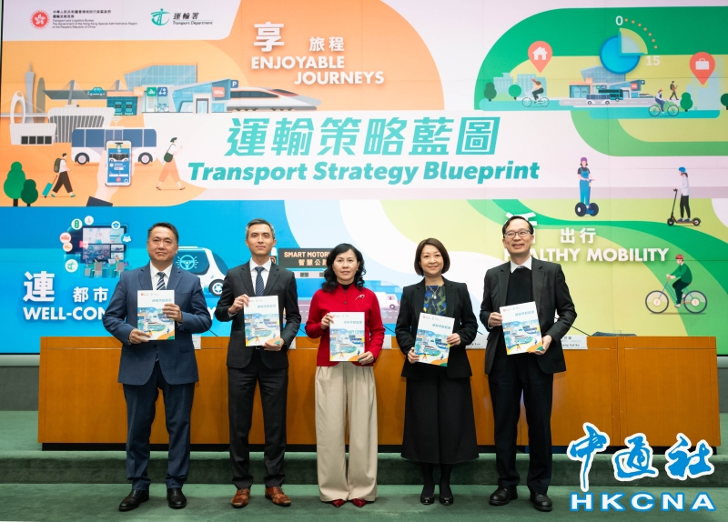 •   2月6日,香港特區運輸及物流局局長陳美寶(中)主持記者會,公佈《運輸策略藍圖》。運輸及物流局常任秘書長丘卓恒(左二)、運輸署署長李頌恩(右二)、運輸署助理署長/策略研究梁世豪(右一)和運輸署助理署長/巴士及鐵路黃志光(左一)亦有出席。 香港中通社圖片