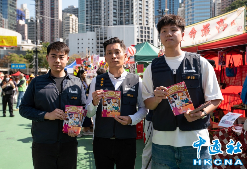 •   2月11日,香港海關在維多利亞公園年宵市場向檔主派發傳單,呼籲切勿售賣侵權物品。(香港中通社记者 陳奕啟 攝) 香港中通社圖片