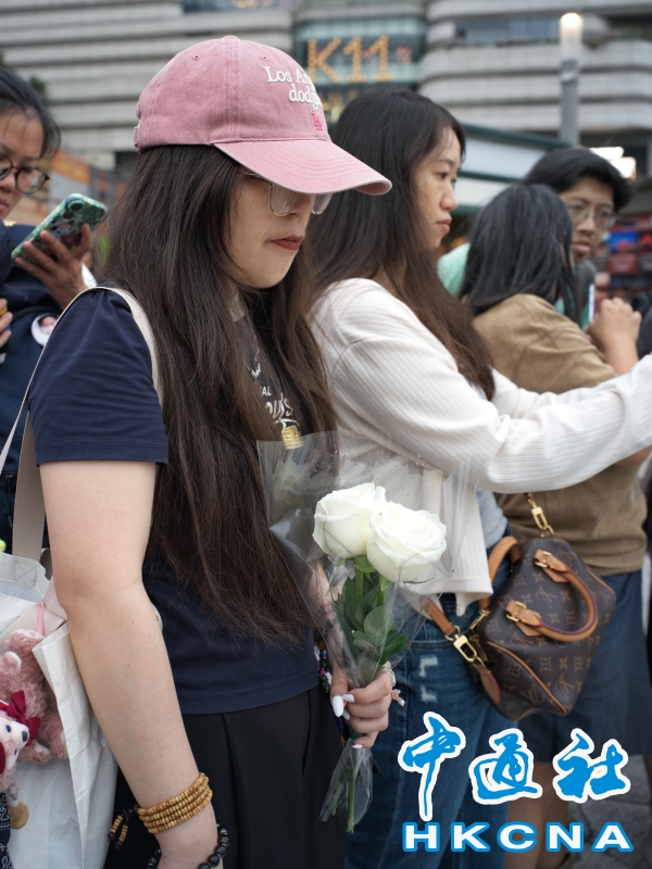 •   4月1日,距離香港歌手、演員張國榮逝世的那個黃昏已過去23年。來自五湖四海的人們卻並未將他遺忘,在尖沙咀星光大道張國榮的手印前,擺滿了寄託思念的鮮花。圖為歌迷手持鮮花,神情哀傷。 (香港中通社記者  謝光磊 攝) 香港中通社圖片