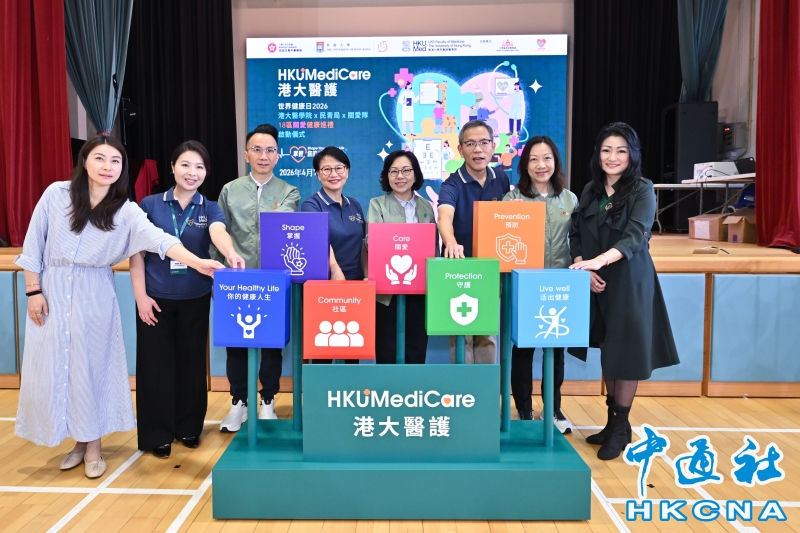 •   4月7日,香港民政及青年事務局、地區服務及關愛隊伍和香港大學李嘉誠醫學院在西營盤社區綜合大樓社區會堂合辦“世界健康日2026:掌握你的健康人生——18區關愛健康巡禮”計劃啟動儀式及首場地區外展健康推廣活動。民青局局長麥美娟(右四)、民青局常任秘書長李百全(左三)、民政事務總署署長杜潔麗(右二)、香港大學行政及財務副校長謝凌潔貞(左四)和港大醫學院院長劉澤星教授(右三)與其他嘉賓主持啟動儀式。 香港中通社圖片