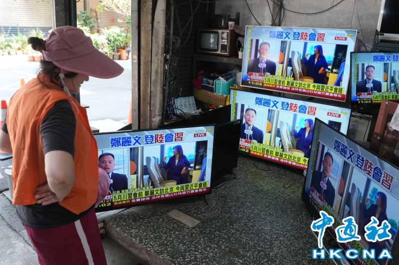 •   4月10日,中共中央總書記習近平與中國國民黨主席鄭麗文在人民大會堂會面。圖為台北市萬華區一店舖内電視正播放相關新聞,吸引民眾駐足觀看。 香港中通社圖片