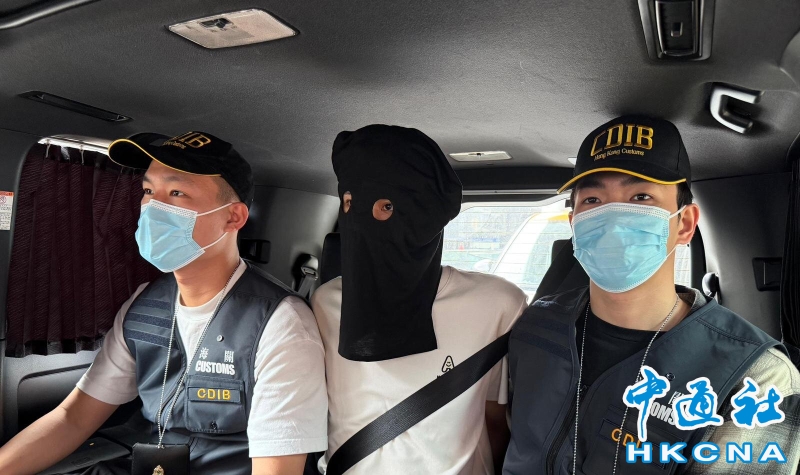 •   香港海關4月10日在香港國際機場偵破一宗行李藏毒的販毒案件,檢獲約二十五公斤懷疑氯胺酮,估計市值約一千萬元。圖為涉案的被捕人士(中)。 香港中通社圖片