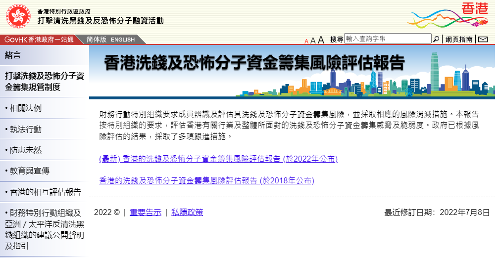 香港中通社7月8日電 香港特區政府8日公佈最新香港洗錢及恐怖分子資金籌集風險評估報告,評估香港有關行業及其整體近年所面對的洗錢及恐怖分子資金籌集的威脅及脆弱度,並首次就香港所面對有關大規模毀滅武器擴散的資金籌集風險作出評估。 報告指出,香港具備穩健的法律架構、高度的政治承擔,而政府機構之間和公私營界別之間擁有緊密的夥伴關係,加上檢控和司法程序公平有效,以及與外地和國際社會合作良好,因此香港在打擊洗錢、恐怖分子資金籌集和大規模毀滅武器擴散資金籌集方面的能力獲評為高水平。