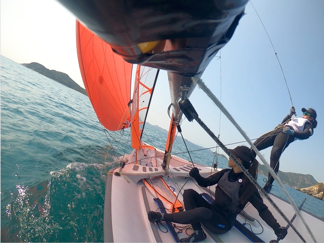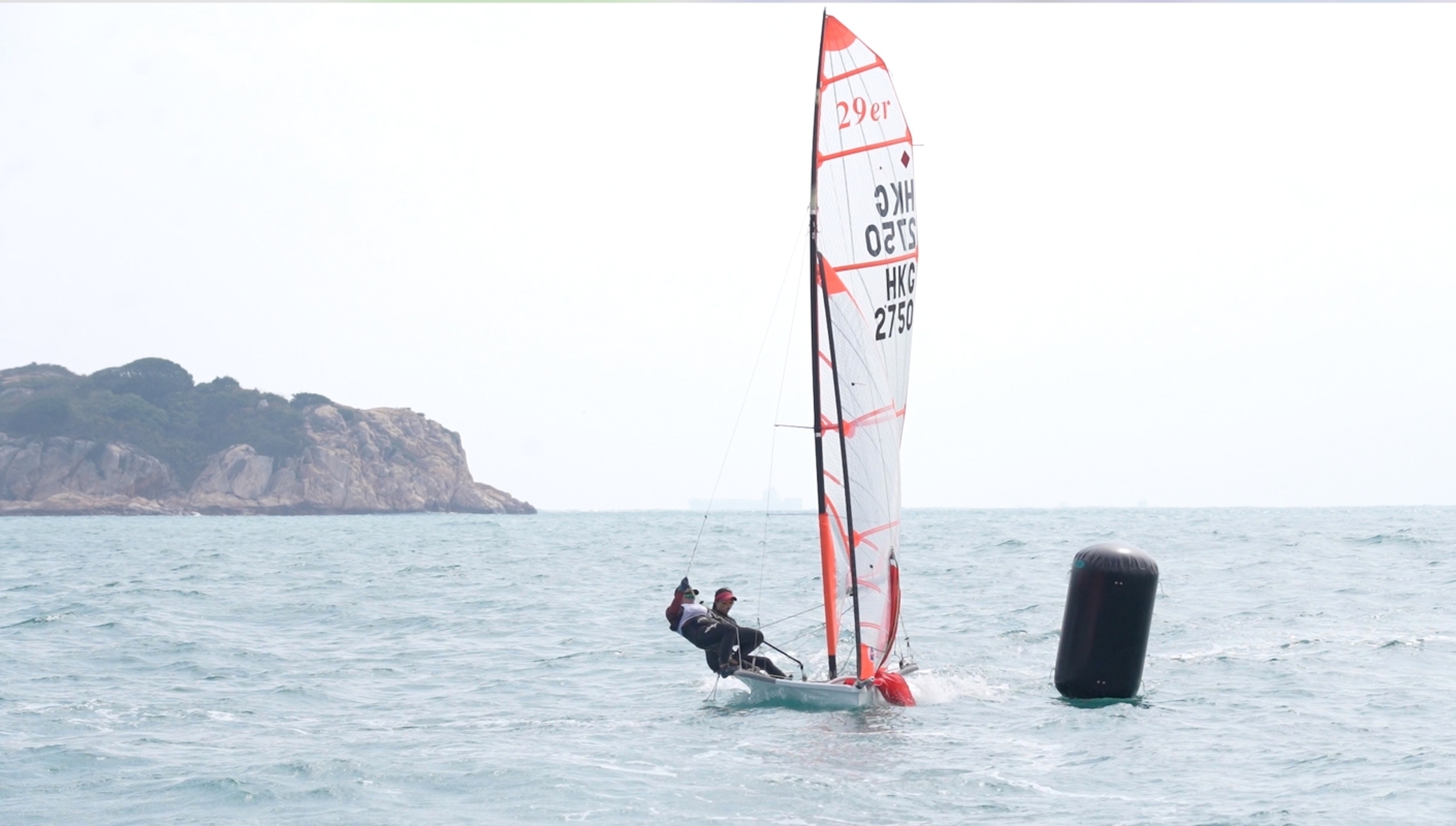 掌舵、升帆、瞭望遠方……都需要她們在船上通力合作。一陣微風刮來,曾濼妍操控著舵桿,麥卓穎手握著繚繩,鮮紅色的布篷迅速升起,帆船也隨著風瞬間提速。