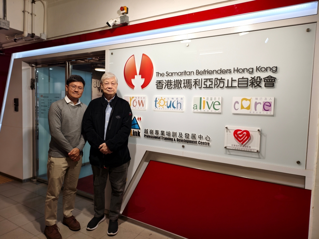 圖為香港撒瑪利亞防止自殺會主席鄔澤銘(右)及熱線中心主任丘鴻生(左)。(香港中通社記者 梁嘉軒攝)