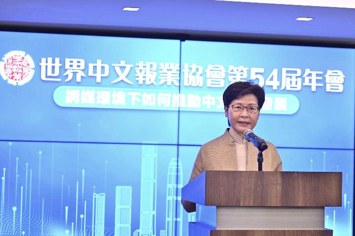 11月18日,香港特區行政長官林鄭月娥在世界中文報業協會第54屆年會致辭。圖源:香港中通社 林鄭月娥指出,科技日新月異,給報業的經營環境帶來重大挑戰,但紙媒與網媒可以並存,應該互相補足,主動糾正社會上流傳的錯誤資訊,引導讀者思考和討論重要議題,幫助社會尋求及凝聚共識。 她表示,傳媒每日行使新聞自由,包括監察和批評政府,希望傳媒能自覺維護國家安全,主動向社會傳遞國家安全訊息。如果國家安全得不到充分保障,新聞自由及各項權利自由亦失去基礎,香港難以長治久安。 她指出,有效發放政府訊息,讓市民更好更快掌握政府政策和最新情況,是管治的重要壹環。面對不少對特區政府惡意攻擊或偏頗報道,政府解說能力有待提升,已要求各司局長在新聞處處長及團隊配合下,更注重發放訊息和解釋政策的工作。 她又以接種疫苗為例,指政府固然有責任多作解說,但專家都一致認為市民應該接種疫苗,具公信力的報章應主動運用公眾影響力,鼓勵市民接種,以保障市民的健康。 【編輯:胡雪石】