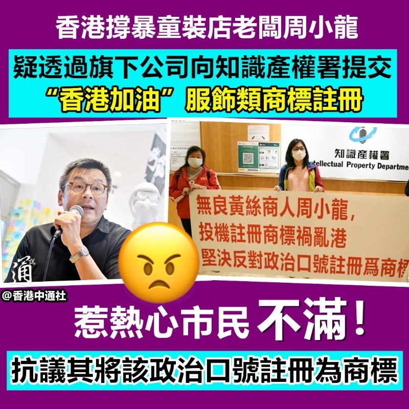 香港新聞網1月18日電 香港童裝店Chickeeduck行政總裁周小龍被揭發,透過旗下公司,向知識產權署提交“香港加油”的服飾類商標註冊。一批香港市民近日前往知識產權署辦事處抗議,反對有人將該政治口號註冊為商標,並向署長遞交請願信。 在知識產權署辦事處門外,三女一男手持“無良黃絲商人周小龍,投註注冊商標禍亂港,堅決反對政治口號註冊為商標”横額,又高叫口號。知識產權署一名男職員代為接收請願信,4名市民其後和平散去,整個過程約30分鐘。