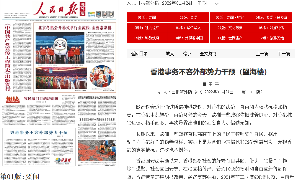 香港新聞網1月24日電 《人民日報》海外版今日(24日)發表評論員文章再次強調,香港事務不容外部勢力干預。