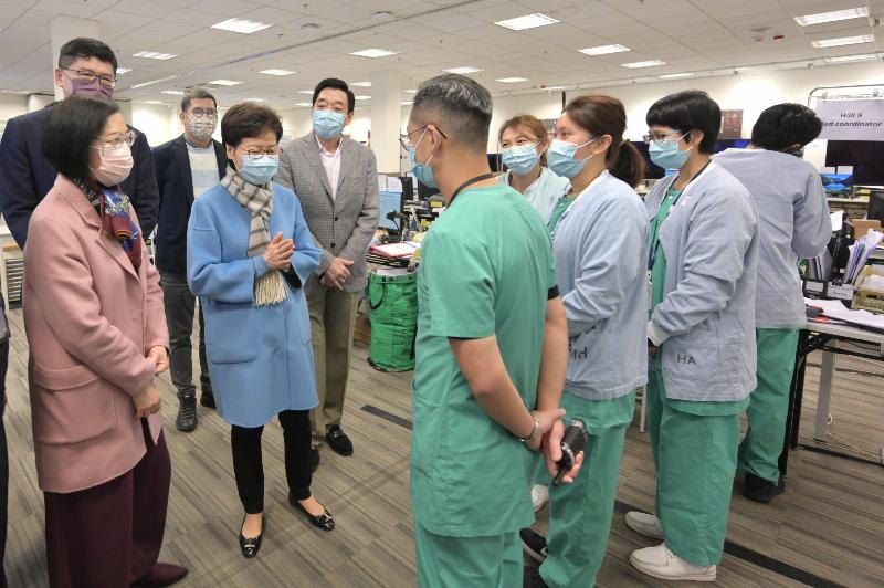 當日,林鄭月娥在食物及衞生局局長陳肇始、醫院管理局主席范鴻齡和醫院管理局行政總裁高拔陞醫生陪同下,到訪位於亞博館的社區治療設施和北大嶼山醫院香港感染控制中心探望醫護人員,聽取負責人匯報相關設施在應對第五波疫情的運作情況和病人治理服務。 林鄭月娥再到訪明愛醫院急症室,聽取醫護人員介紹急症室在農曆新年的運作安排和處理傳染病病人的流程。林鄭月娥高度讚揚醫護人員一直站在抗疫最前線,並感謝他們在新春期間仍不眠不休地工作,致力為病患者提供優質服務,守護全城市民健康。 林鄭月娥其後轉往兩所檢測承辦商——駿嶺生物科技和金域檢驗(香港),探望工作人員和聽取管理層講解在社區提供檢測服務和進一步提升檢測能力的情況。她感謝承辦商人員在節日中繼續不辭勞苦地全力支持特區政府抗疫,除了營運社區檢測中心外,亦不時應特區政府的要求,在短時間內動員在指定地區設立流動採樣站,為當區居民和其他有需要人士提供檢測服務。# 【編輯:崔靜雯】