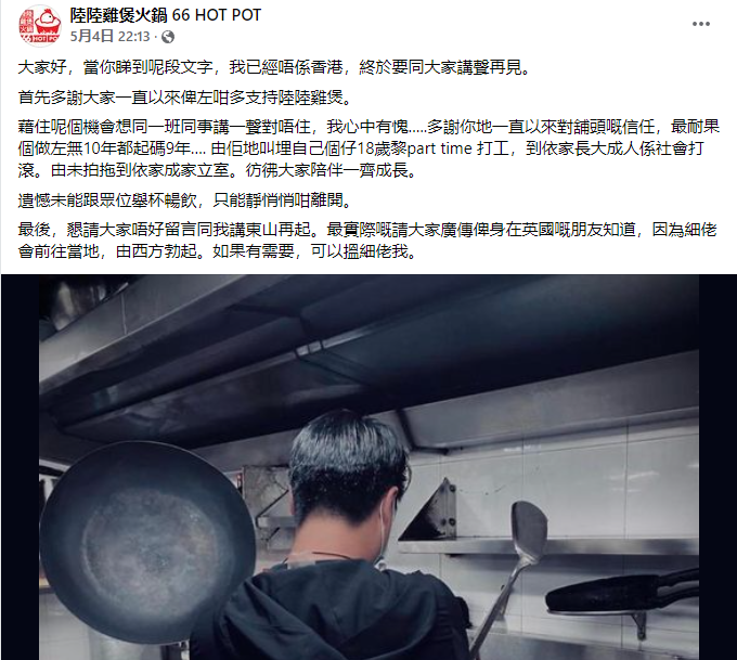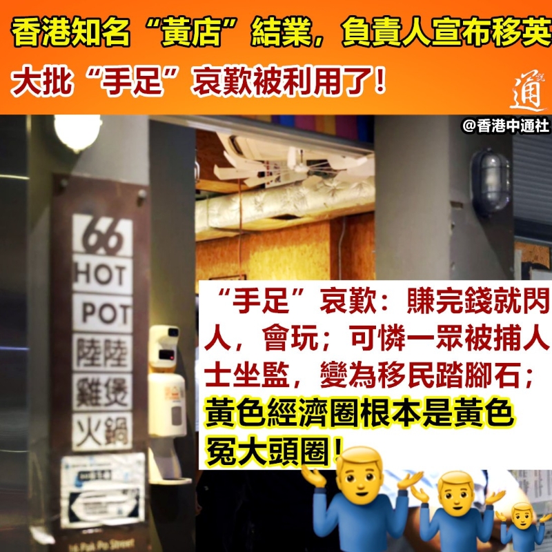 香港新聞網5月6日電 香港“黃店”賺够了,拍拍屁股移英了……“手足”才幡然醒悟,自己竟成了冤大頭! 香港知名“黃店”、以四川麻辣雞煲為主打產品的旺角陸陸雞煲火鍋4日晚突然在社交媒體發文宣布結業。其負責人聲稱,當市民看到這段文字時,“我已經不在香港......遺憾未能與眾位舉杯暢飲,只能靜悄悄地離開。” 其負責人自曝會前往英國,在英國捲土重來,又希望“手足”能將消息傳遞給身處英國的港人。