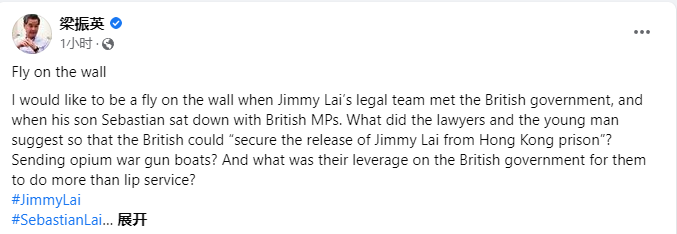 香港新聞網1月13日電 壹傳媒創辦人黎智英涉嫌違反香港國安法遭起訴,案件將於9月開審。早前,黎智英的海外法律團隊去信英國政府,要求與首相辛蘇納克緊急會晤,在黎智英接受國安法審訊前商討如何爭取讓黎智英獲釋。黎智英三子黎崇恩11日亦與英國國會議員會面,乞求蘇納克立即採取行動“讓黎智英獲釋”。 香港前特首梁振英今日(13日)在社交媒體上連番多篇帖文談及此事。他稱,當黎智英的律師團隊會見英國政府官員、當黎智英的兒子與英國國會議員會面時,他們提了什麼建議,以確保黎智英能夠獲釋?“要求英國政府派鴉片戰爭時期的炮艦嗎?他們手上有什麼牌可以讓英國政府出手,而不僅是出口?”