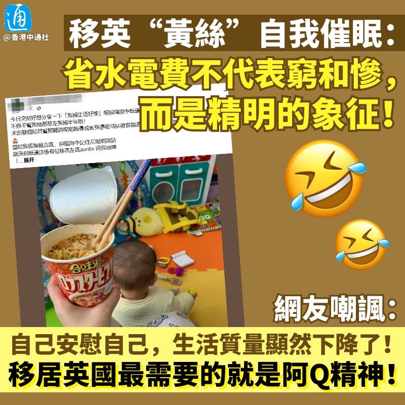 香港中通社製圖 該網友開始用阿Q精神安慰自己,稱減價貨品“又便宜又正”,天天洗碗特別煩,那幾天洗一次髒碗筷不僅省錢,又“省時省力”,還讓她“心情更好”,那“何樂而不為呢”? 在貼文最後,該網友還自我洗腦,稱移民一定會有“忍和捱”的階段,但“不經一番徹骨寒,哪來梅花撲鼻香”。聲稱經歷過才明白,香港人在異國他鄉“能屈能伸”,又有聰明的頭腦和計劃,怎麼會過得慘呢? 興許是找到了“遮羞布”,此番強行美化移英生活窘況的言論其後獲一眾“黃友”追捧!在該貼文的評論區,有“同路人”補充,在英國節衣縮食不只是為了省錢,還為了環保、為了所謂“成就感”。 “自己安慰自己,生活質量顯然下降了!”然而,不少眼明心亮的香港網友卻紛紛感歎,至今移英港人還在自欺欺人。強調節約本是好事,但問題是移英港人沒得選,他們“省錢大法”的背後完全是生活所逼。 有網友就質疑,難道幾天洗一次碗筷真的不會有異味、引來蟲子嗎?這樣的生活真的快樂嗎? 還有網友嘲諷,移居英國最需要的就是阿Q精神,面對生活質量大幅下降,“有阿Q精神生活就會好過很多。”