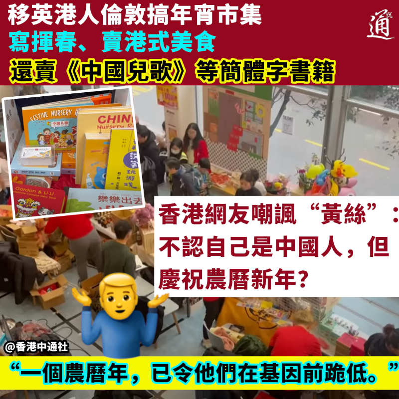 (製圖 劉春) 也有網友留意到“英倫年宵聚”上售賣的《中國兒歌》等書籍,揶揄這些“黃絲”是否移英後又驚覺中國市場巨大,明白學好漢字、說好普通話的重要性…… 還有網友就“黃絲”移英後不參與英國人轟轟烈烈的大罷工,反“圍爐”搞年宵市集感到“不解”——“幹什麼不適應英國文化,要搬(中國)香港文化去那裡!” 香港知名媒體人屈穎妍也在社交媒體發文表示,日前看新聞,英國倫敦、伯明翰、曼城等香港人熱門移居城市,都有“黃絲手足”搞年宵市集,賣的是中式傳統美食、港式小吃、賀年裝飾、揮春、利是封等等。 “一群棄國者、叛國者,以身為中國人為恥,口口聲聲我不是中國人,但到頭來,一個農曆年,已令他們在自己的基因面前跪低,不認不認還須認。” 屈穎妍質問移英“黃絲”:如果不是中國人,貼什麼揮春?過什麼兔年? 她一針見血地指出,原來習慣了過年的儀式感,以後無論跑到天涯海角,一到農曆新年,身體內的血液就會告訴你:國是什麼?家在哪裡? 【編輯:刘春】