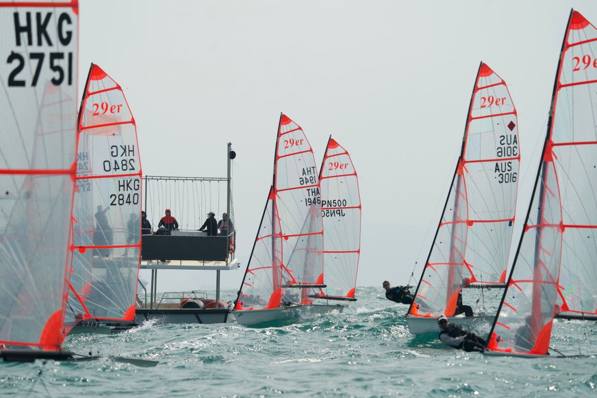 各級別帆船在香港帆船賽週展開首日比賽。圖為29er型帆船