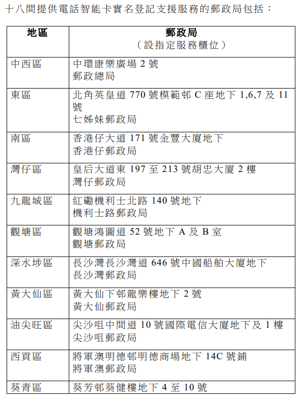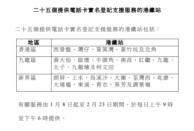 定港鐵站的支援服務站。香港中通社資料圖片 丘應樺又說,臨近登記限期系統可能較為繁忙,呼籲市民提前登記,以免影響電話服務。 尚未完成實名登記的“太空卡”用戶,可按電訊商發出的登記提示短訊,透過所屬電訊商的網頁或流動應用程式完成實名登記,亦可到所屬電訊商門市或18間指定郵政局設立的服務櫃位尋求協助。有關郵政局的服務櫃位將於2月22日及23日(即登記限期當日)延長服務時間至晚上7時,以處理限期屆滿前可能急增的求助個案。