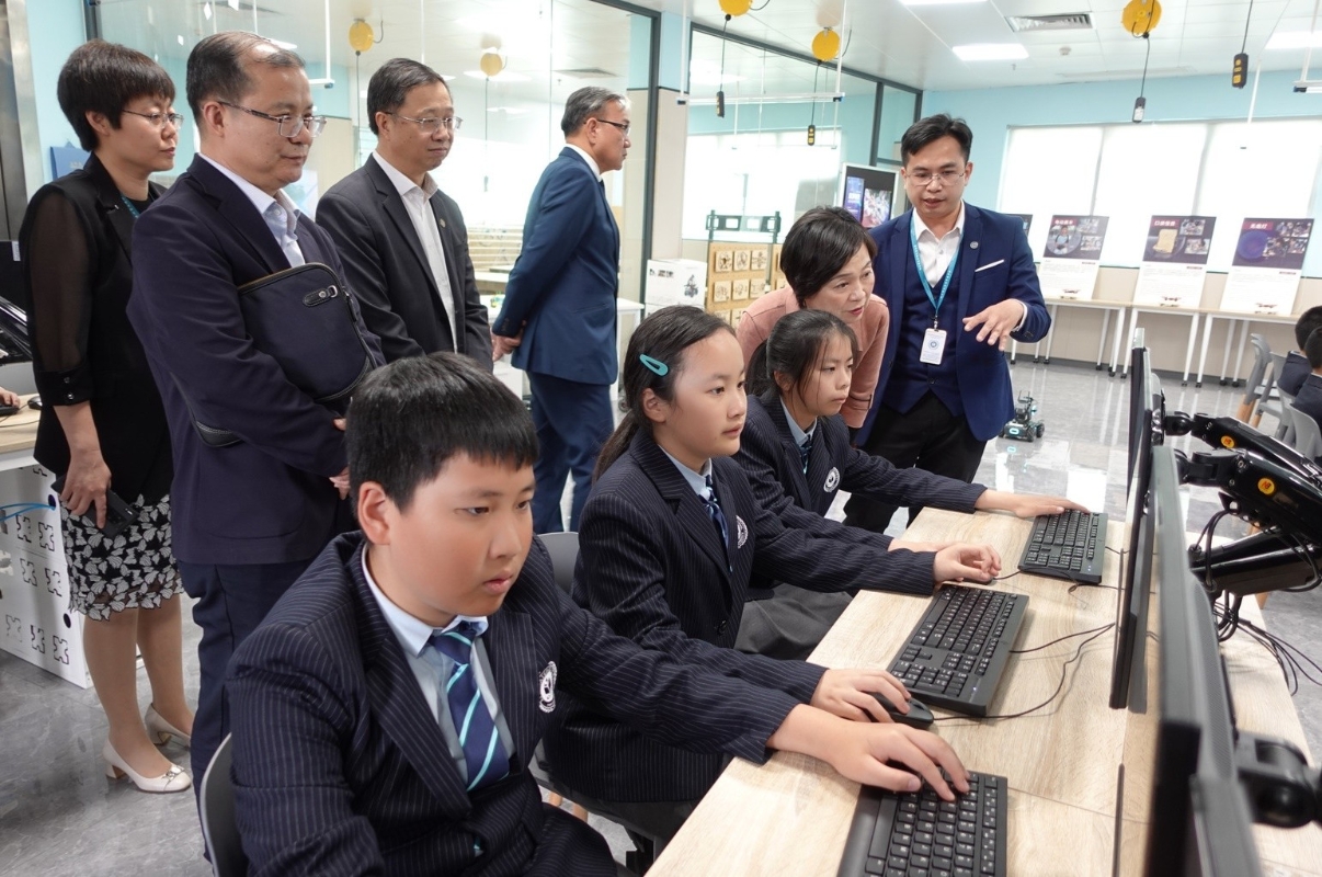 蔡若蓮到訪廣州暨大港澳子弟學校,了解港人子弟在內地求學情況。圖示蔡若蓮(前排右二)觀察學生學習機械人技術。