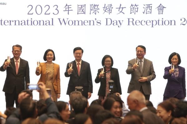 香港新聞網3月8日電 香港特區行政長官李家超及夫人李林麗嬋8日主持民政及青年事務局與婦女事務委員會舉辦的2023年國際婦女節酒會。李家超致辭時表示,特區政府將繼續與婦女事務委員會合作,從多方面推動婦女權益。 李家超致辭時表示,婦女在香港的各行各業都發揮領導作用,現屆政府26位主要官員之中,一共有6位女士,佔團隊近四分之一,比例是歷屆政府最高。在政府公務員當中級別最高的18位常任秘書長當中,亦有超過六成為女性。在政府委任的諮詢及法定組織非官方成員中,女性佔36%,與20年前相比,高10個百分點。由此可見,香港女性參與社會發展的貢獻已舉足輕重。