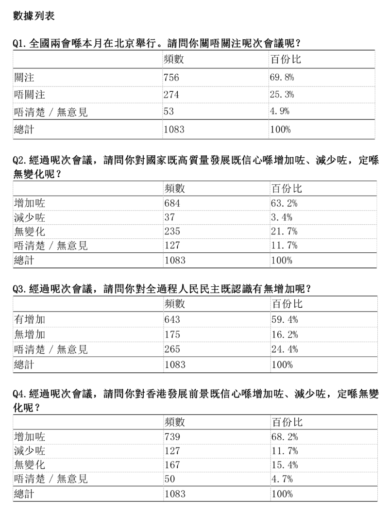 調查指近7成港人關注全國兩會 正面情緒指數創5年來新高香港新聞網3月15日電 全國兩會在北京順利閉幕,紫荊研究院於3月4日至14日期間,透過電話隨機抽樣成功訪問了1083名18歲或以上香港市民,了解他們對兩會的關注度、對全過程人民民主的認識,以及對兩會後國家和香港發展前景的信心。調查發現,近7成受訪市民關注全國兩會,逾6成受訪市民對國家和香港發展前景更有信心。另外,中評智庫大數據中心通過分析香港社交媒體上的輿情數據,發現香港市民對今次全國兩會的反應呈現整體積極的態勢,正面情緒指數創下近五年來新高。 紫荊研究院調查指,2023年全國兩會是換屆的大會,也是國家在防疫控疫工作取得重大勝利後的首次大會。連日來,香港媒體對全國兩會進行了廣泛報導。調查顯示有69.8%受訪市民關注全國兩會,表示不關注的有25.3%,另有4.9%表示不清楚、無意見。 此外,政府工作報告指出,國內生產總值5年年均增長5.2%。在此非凡成就下,調查指出63.2%受訪市民增強對國家高品質發展的信心,21.7%表示信心不變,3.4%表示信心減少,另外有11.7%表示不清楚、無意見。 調查同時發現68.2%受訪市民對香港發展前景信心有所增加,15.4%表示信心沒有變化,11.7%表示信心減少,另有4.7%表示不知道、無意見。 全國兩會是實踐全過程人民民主的重要制度載體。圍繞香港市民對全過程人民民主的認知,調查亦指出有59.4%受訪市民通過關注全國兩會,對其認識有所增加,有16.2%則表示沒有增加,另有24.4%表示不知道、無意見。