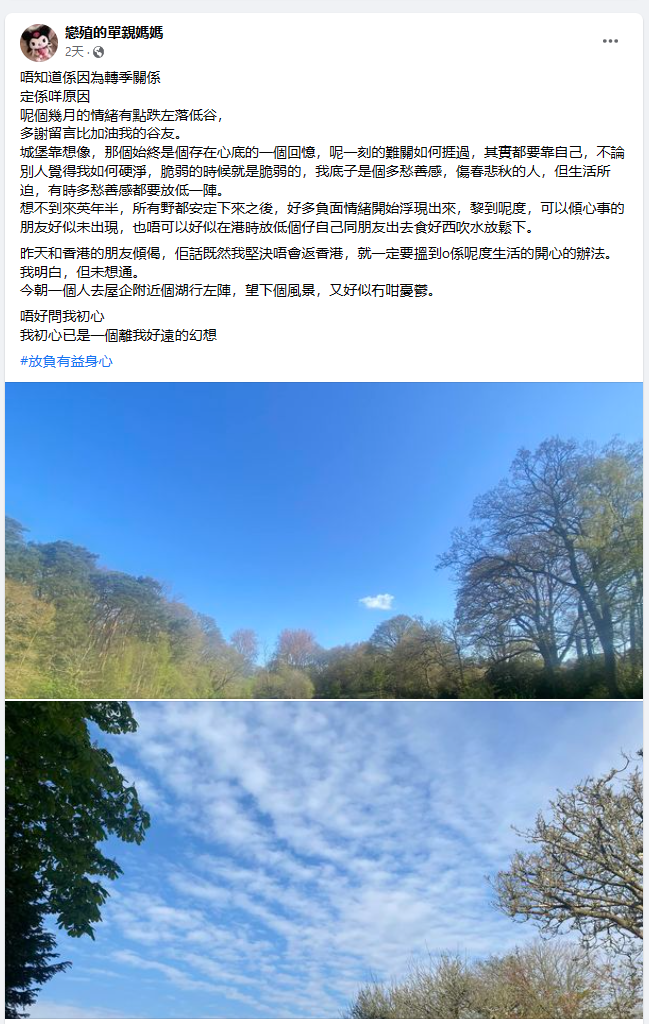 香港新聞網4月28日電 日前,一位移居英國、網名為“戀殖的單親媽媽”的香港網友在社交平台發帖稱,來英國已經半年了,在所有一切安定下來後,卻發現“好多負面情緒開始浮現出來”。她更哭訴近幾個月的情緒幾乎“跌落低谷”。