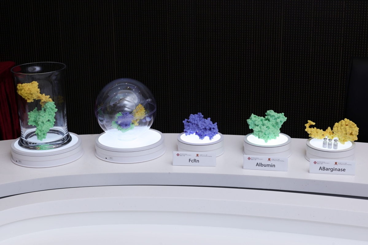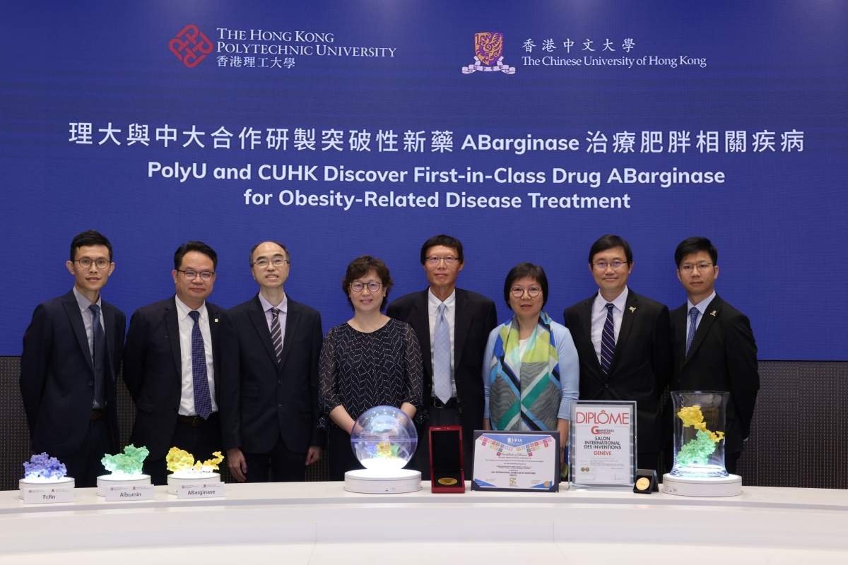利用三維打印分子模型展示ABarginase、白蛋白與 FcRn receptor在細胞表面的相互作用。 有關研發由理大應用生物及化學科技學系教授、盧家驄慈善基金藥物科學教授梁潤松教授,以及中大醫學院生物醫學學院副教授沈秀媛教授領導。 肥胖不單止影響體形,更往往涉及許多慢性疾病如糖尿病、非酒精性脂肪肝、心臟病、高血壓及癌症等。理大與中大研究團隊取得重大突破,發現當血液內一種半必需氨基酸——精氨酸——處於低水平,即是所謂“精氨酸飢餓”的狀態,細胞會抑制脂肪合成,促進脂肪分解,並且增強對胰島素的敏感度。不過在普通情況下,人體內可以分解精氨酸的精氨酸酶,它的循環半衰期為時甚短,只有不足三十分鐘。 梁潤松說,通過採用先進的融合蛋白方法,我們的研究團隊研製出一種長效的重組人類精氨酸酶ABarginase,它含有一個白蛋白結合域,使其能夠與血液中穩定而又充沛的白蛋白結合,從而延長其循環半衰期約200倍。ABarginase具有較強的酶活性,每星期只需注射一劑量,就足以使血液循環中的精氨酸保持在低水平,從而達到精氨酸飢餓的狀態。 研究人員在兩組經飲食誘導的肥胖小鼠,每周一次分別注射ABarginase和生理鹽水。八星期後,相較注射鹽水的對照組,ABarginase組的小鼠無論在體重、脂肪量、脂肪肝,或糖尿病徵狀如高血糖、胰島素抵抗和葡萄糖耐受不良均回復正常水平。 沈秀媛表示,ABarginase在臨床前研究的結果已經展現巨大潛力,可望為治療多種與肥胖、胰島素抵抗、糖尿病等相關的代謝性疾病提供安全而有效的方案。其中非酒精性脂肪肝至今未有獲美國食物及藥物管理局認可的藥物,因此ABarginase的研發對治療非酒精性脂肪肝尤其意義重大。我們相信已經研發出可以治癒這些相關疾病的單一藥物。 研究團隊已在多個國家為新藥申請專利;目前正提升製藥工藝至符合生產質量管理規範(GMP)的品質要求,為開展臨床試驗做好準備。 在備受全球創科界重視的第四十八屆日內瓦國際發明展,香港奪得兩項最高殊榮的大獎,而ABarginase就是其中得獎發明之一,獲頒“發明者協會國際聯合會(International Federation of Inventors' Associations, IFIA)最佳發明大獎”,肯定新藥對改善病人福祉及全球醫療衛生的潛力,亦彰顯本港院校間的科研合作水平備受國際認可。 肥胖是全球普遍的健康問題。根據世界衛生組織的最新估計,2016年全球成年人中,有逾十九億人屬超重及6.5億人屬肥胖,分別佔成年人人口的百分之39及13。而在香港,約兩名成年人中便有一人的體重指標被界定為超重或肥胖。(完) 【編輯:崔靜雯】