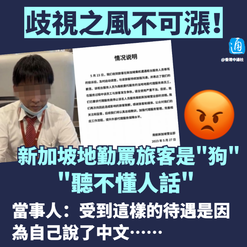 香港中通社製圖 對此,南航證實收到袁先生的投訴,稱事件正在調查。27日晚間,中國南方航空駐新加坡營業部發布公告稱,該櫃檯服務人員為南航委託服務的當地地面代理服務商員工,南航已要求代理服務商停止該名人員服務南航新加坡營業部的資格,南航也表示已向袁先生道歉,未來將認真總結教訓,加強代理服務管理。 前有國泰航空風波,後有新加坡地勤人員罵乘客是“狗”,有網友在社交平台上憤怒地說,“有些人以為自己會說幾句英語,就自我感覺高一等,歧視同類!” 也有網友發文分享類似遭遇,指自己兩三年前從蘇黎世飛新加坡時,和一位新加坡空姐說廣東話,空姐用英文回覆,全然不顧自己聽不明白。“但我明明聽到該空姐與同事說廣東話……” 不過,也有部分網友認為通過網傳視頻恐難以了解事情全貌,“未知投訴人本身之前態度如何,只聽片面之詞,難以下定論。”有網友隨即反駁稱,就算客人有不對的地方,辱罵對方是“狗”依然非常過分。“如果他真的是在不適當的時候問,那個職員應該表現專業的態度,禮貌地說請稍候一會兒。說客人是狗,就是侮辱、是歧視。” “身為新加坡人感到羞恥。”事件亦引發新加坡網友留言關注,指就算客人多麼無理,員工也不應該語言攻擊客人!整個地勤服務公司要立刻重新教育員工。” 香港行政會議召集人、新民黨主席、立法會議員葉劉淑儀昨日(28日)亦在社交平台發文指出,作為一名服務員(無論是什麼類型的服務員),嘲笑顧客來源地、膚色或語言都是歧視。“作為一個專業、思想成熟的服務員,任何情況下都不應該嘲笑顧客。尊重客人、以禮待人才是專業的表現。” 【編輯:李冉】