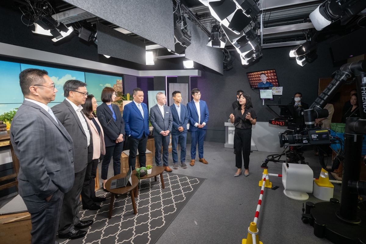圖片來源:香港政府新聞處。圖示事務委員會主席何君堯(左二)和其他議員參觀廣播大廈的電台視像節目錄音室。