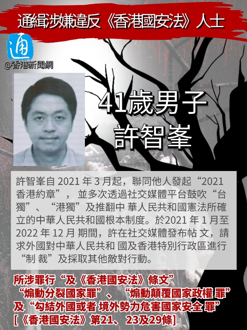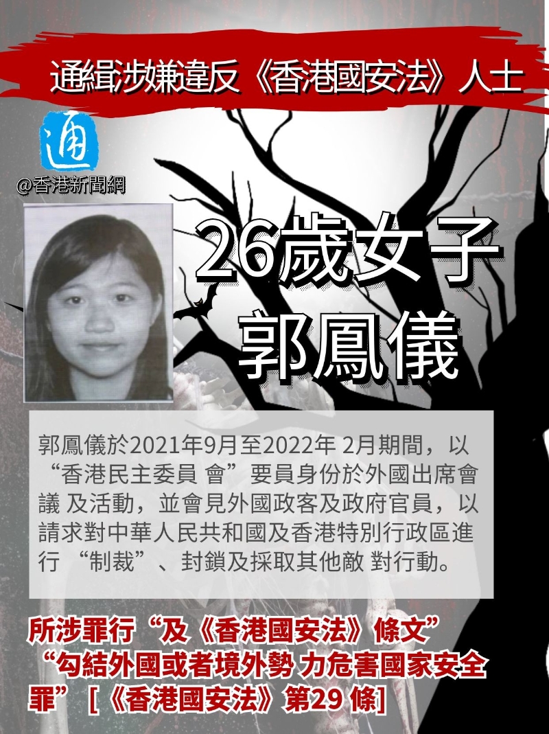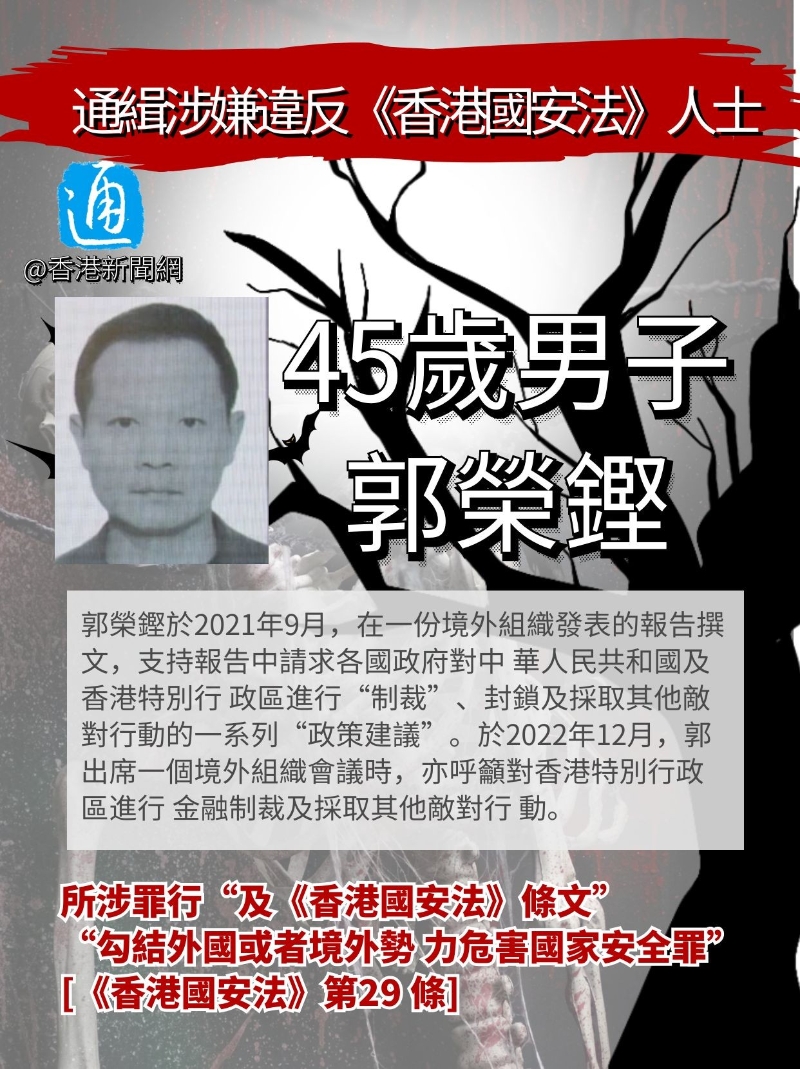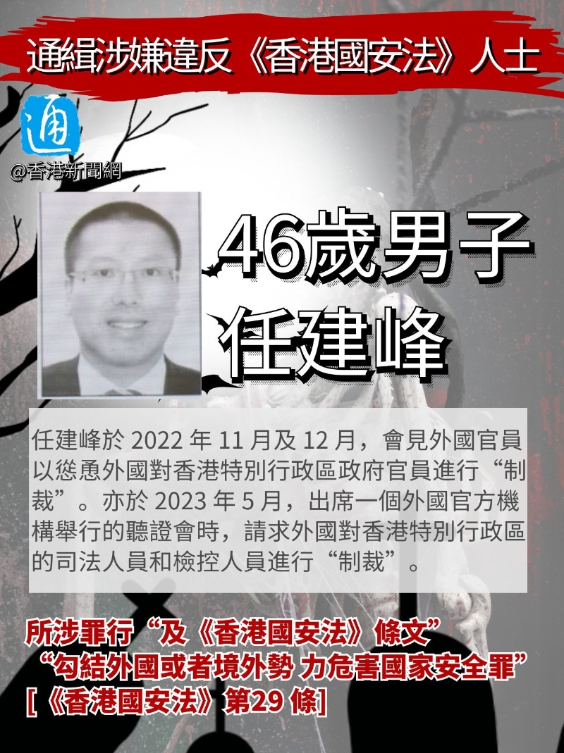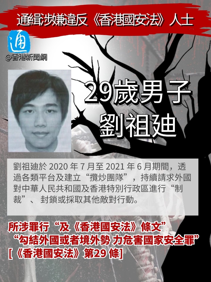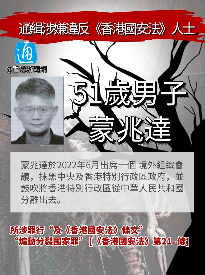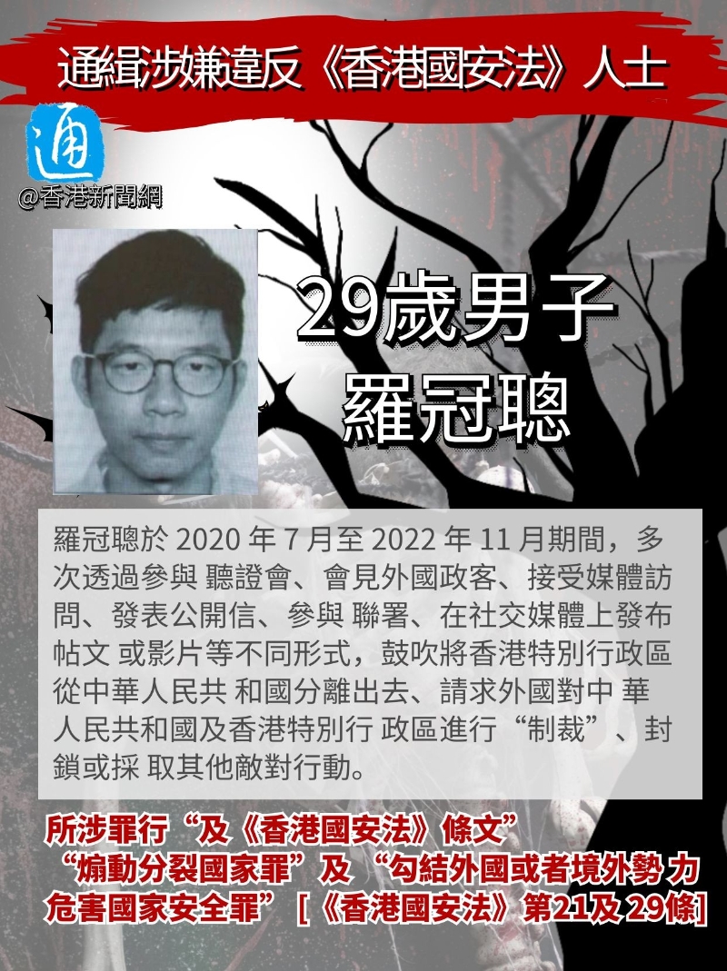 香港新聞網7月3日電 警務處國家安全處今日(七月三日)表示,早前獲法院批准,就八名潛逃海外並涉嫌干犯《中華人民共和國香港特別行政區維護國家安全法》(香港國安法)罪行的人發出拘捕令,警方現正通緝在逃人士。 男子任建峰、男子袁弓夷、女子郭鳳儀、男子郭榮鏗、男子許智峯、男子蒙兆達、男子劉祖廸及男子羅冠聰,共八名人士,竄逃外地後涉嫌繼續實施《香港國安法》下的罪行,包括“煽動分裂國家罪”、“顛覆國家政權罪”、“煽動顛覆國家政權罪”及“勾結外國或者境外勢力危害國家安全罪”,嚴重危害國家安全。警方遂依法向法院申請拘捕令,並通緝有關人士。(通緝各人的法律依據和基本事實見於附件) 警方高度重視該案,現就每名被通緝人士懸紅一百萬元賞格,呼籲市民就有關人士或相關案件提供消息。 警方發言人指出:“危害國家安全是非常嚴重的罪行,該類行為或活動可能造成極為嚴重的後果。根據《香港國安法》第三十七條,《香港國安法》適用於在香港特別行政區(特)以外地方干犯《香港國安法》下罪行的香港特區永久性居民,及在香港特區成立的公司及團體等法人及非法人組織。另外,根據《香港國安法》第三十八條,對於不具有香港特區永久性居民身分的人,如果在香港特區以外針對香港特區干犯《香港國安法》下罪行,《香港國安法》亦同樣適用。因此,香港警方有責任依法追究在境外涉嫌干犯《香港國安法》罪行的人。” 警方亦同時指出,不論以任何形式,包括透過互聯網,任何人協助、教唆、以金錢或者其他財物資助他人干犯危害國家安全罪行,同屬違法行爲。警方呼籲社會大眾不要以身試法,警方會對有關犯罪行為嚴正執法。(完)