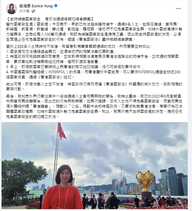 容海恩fb圖片。 對於有聲音質疑通緝的成效, 容海恩表示,即使涉案人士並不在港,特區政府仍有可根據《香港國安法》所具備的域外效力,採取相應的實際行動。 她舉出四點作用,指國安處可依法通緝這些罪犯,並凍結他們的相關涉案犯罪財產;而特區政府可先諮詢律政司意見,並在取得相關法律意見及香港法庭發出的拘捕令後,正式通知相關國家,要求當地執法機關將逃犯拘捕,繼而引渡回港受審;即使該國家已暫時終止與香港的移交逃犯協議,但仍可按個別事件合作;中國是國際刑警組織(INTERPOL)的成員,而香港屬於中國支局,可以要求INTERPOL通過全球近200個國家成員,通緝《香港國安法》逃犯。 至於其中一名通緝人士袁弓夷為其丈夫袁彌昌的父親,容海恩重申,自己已於2022年8月登報宣布與袁弓夷脫離關係,因此其行為與自己無關。她強調,任何人士均不得危害國家安全,而袁弓夷在海外籌組所謂“香港議會”,推動以“公投”推翻中央和特區政府,又要求制裁香港法官,有關行為已涉顛覆國家政權罪、勾結外國或境外勢力危害國家安全罪。就此,她支持國安處的決定,應把任何危害國家安全的疑犯繩之於法,必須全面遏止任何危害國家安全的行為。