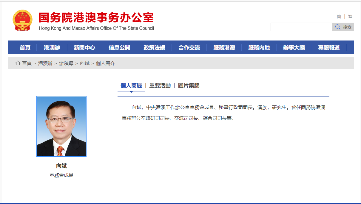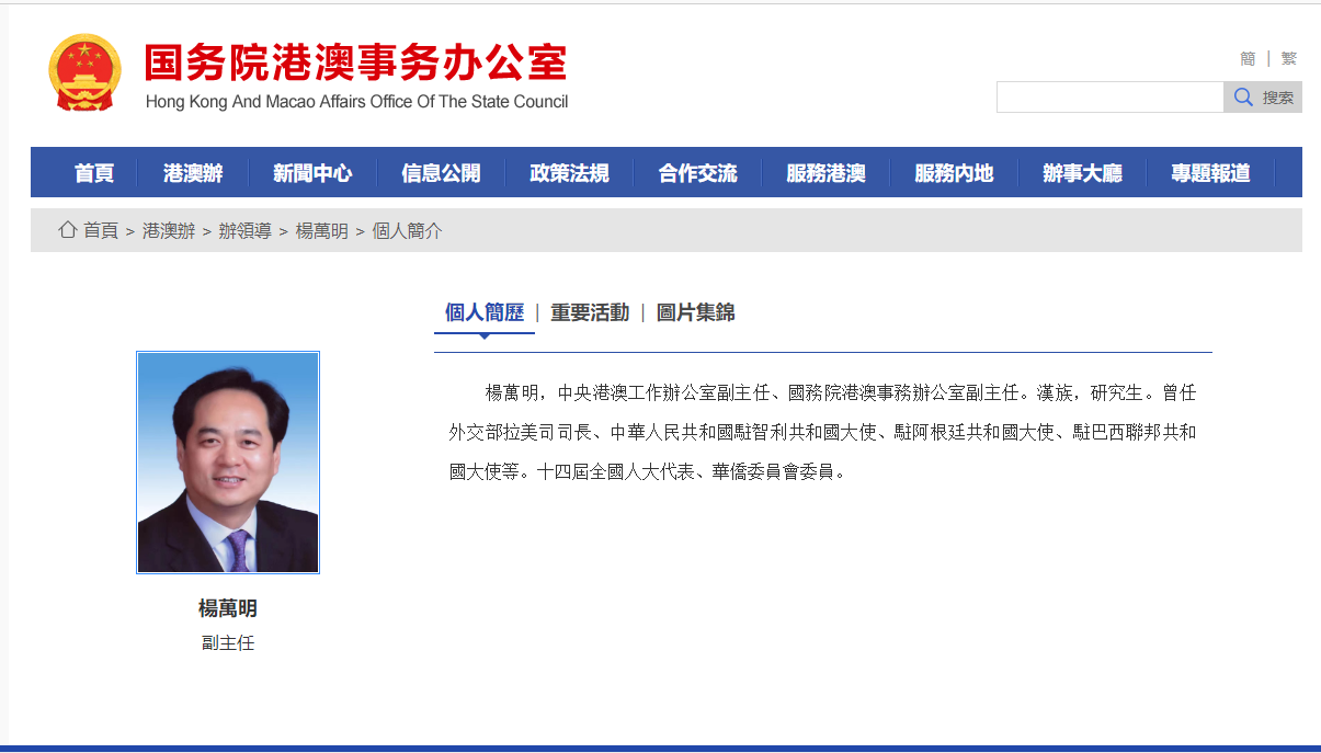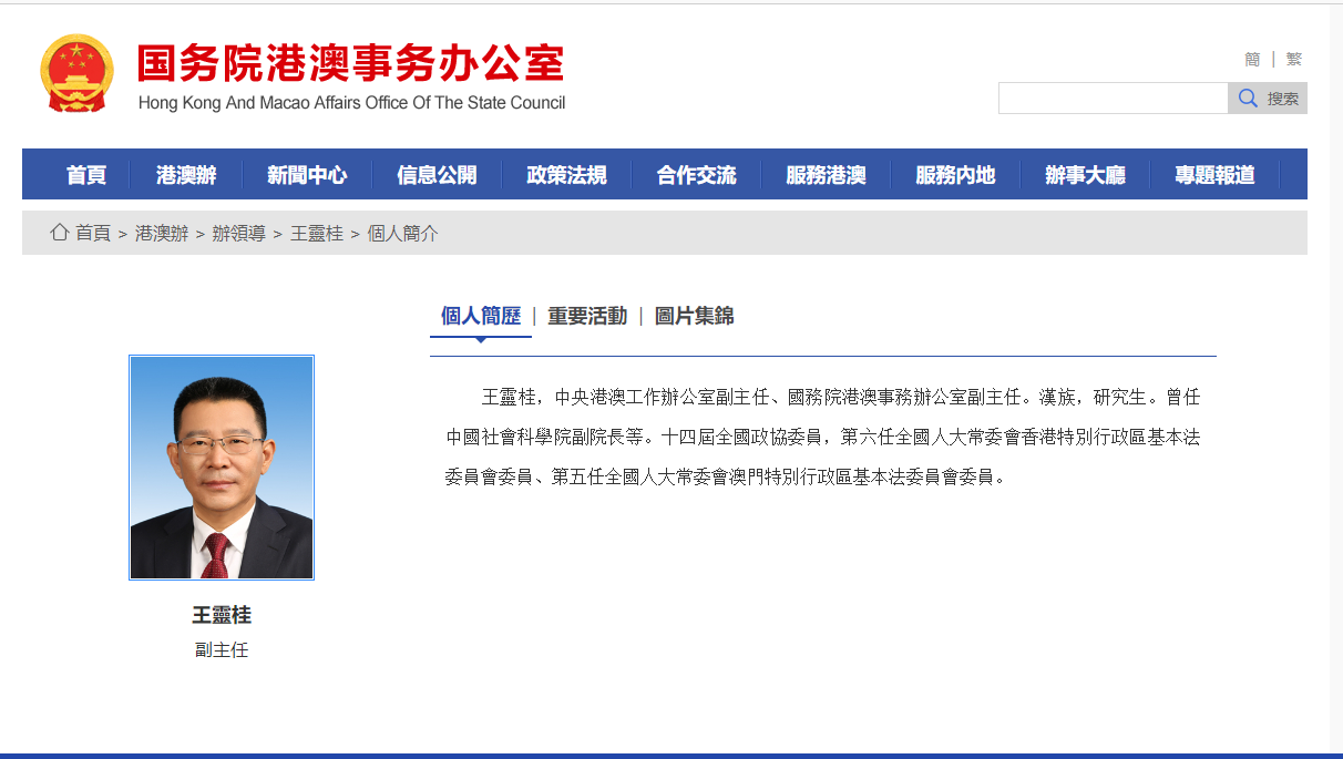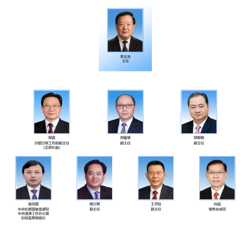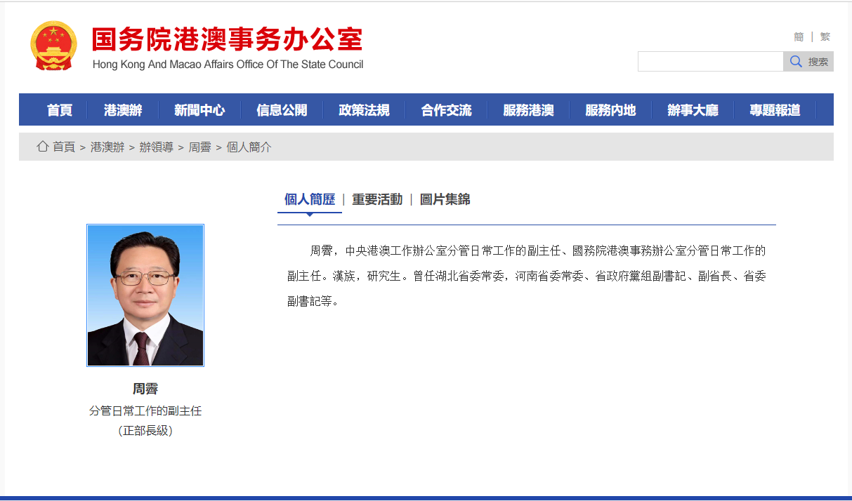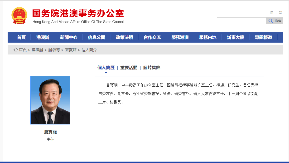 國務院港澳辦網站今日下午更新了辦領導名單及簡歷。中央港澳辦主任是夏寶龍,副主任有五位,分別是周霽(分管日常工作的副主任,正部長級)、鄭雁雄、鄭新聰、楊萬明、王靈桂。