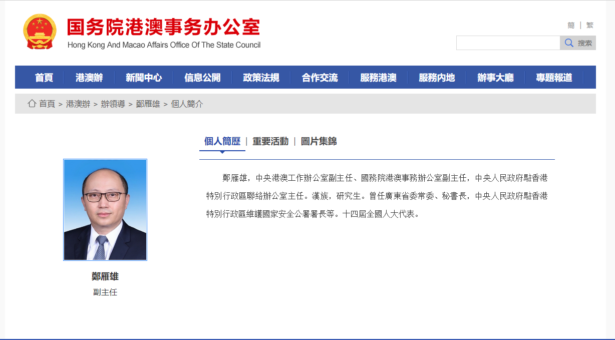 鄭雁雄簡歷。 鄭雁雄,中央港澳工作辦公室副主任、國務院港澳事務辦公室副主任,中央人民政府駐香港特別行政區聯絡辦公室主任。漢族,研究生。曾任廣東省委常委、秘書長,中央人民政府駐香港特別行政區維護國家安全公署署長等。十四屆全國人大代表。