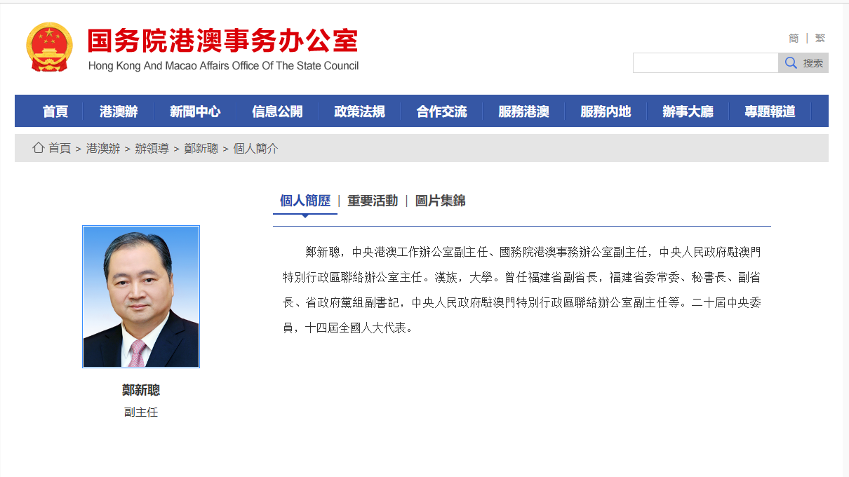 鄭新聰簡歷。 鄭新聰,中央港澳工作辦公室副主任、國務院港澳事務辦公室副主任,中央人民政府駐澳門特別行政區聯絡辦公室主任。漢族,大學。曾任福建省副省長,福建省委常委、秘書長、副省長、省政府黨組副書記,中央人民政府駐澳門特別行政區聯絡辦公室副主任等。二十屆中央委員,十四屆全國人大代表。