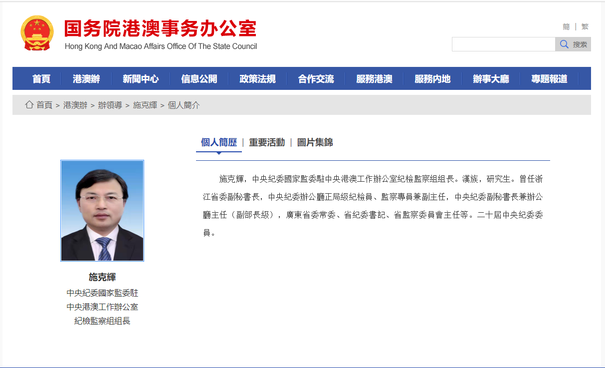 施克輝簡歷。 施克輝,中央紀委國家監委駐中央港澳工作辦公室紀檢監察組組長。漢族,研究生。曾任浙江省委副秘書長,中央紀委辦公廳正局級紀檢員、監察專員兼副主任,中央紀委副秘書長兼辦公廳主任(副部長級),廣東省委常委、省紀委書記、省監察委員會主任等。二十屆中央紀委委員。