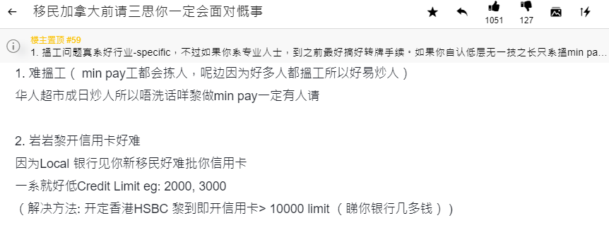 該港人在帖文中列出多個在加拿大生活可能面臨的難處,包括難找工作、買菜吃飯昂貴,以及還要支付13%的消費稅等。 該移加港人一上來便吐苦水,稱在加拿大難找工作,原因是找工作的人太多,所以企業很容易炒人,並舉例一些新移加港人的“舒適區”華人超市就整天炒人。該港人奉勸動了移民心思的人認清現實,不要想著只拿“最低工資”就一定會有人請。 就國外通用的信用卡,該移加港人亦分享自身經歷,稱“剛來開信用卡好難”。形容當地的銀行見到客戶是新移民,都很難批出信用卡。即便批了,信用卡的額度往往也只有2000至3000加元,即不到1萬8港幣。 此外,加拿大的電話費、網費、車費都很貴,外出吃飯及買菜等還要另付13%的消費稅。 該移加港人舉例,若一個人的晚餐價格為15.99加元(約合港幣95元),結賬時還要支付13%的消費稅及堂食至少10%的小費,即是說,最後需付19.88加元(約合港幣119元)。 在香港時,“黃絲”常埋怨樓價高,豈料到了加拿大同樣要面臨因高樓價而租房難的問題。 該移加港人形容,一間出租房常常是3個人都看中,這時候就要跟別人搶;而且有些“靚樓”還只能由加拿大人做擔保人,若在當地沒有親人,基本不用考慮了。 同時,在加拿大,只有舊樓才會包水、電及供暖,新樓大多只包一樣,有些連車位都不包括在內。 生活成本不可謂不高昂!