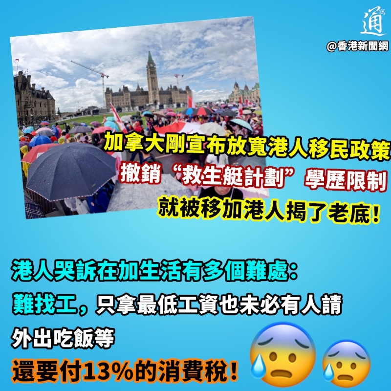 加拿大剛宣布放寬港人移民政策,就被移加港人揭了老底!香港新聞網7月14日電 加拿大剛宣布放寬港人移民政策,那邊廂就被移加港人揭了老底...... 加拿大宣布撤銷“B類工作移民計劃”的學歷限制,即在加拿大有一年工作經驗的港人透過“救生艇計劃”申請永久居留時,無需再提供學歷證明。但良民證方面,仍未放寬。有關計劃自8月15日起生效。 加拿大的新政一推出,即引起部分“黃絲”關注。 在“黃絲”扎推的連登討論區上,這幾日,圍繞“移民”加拿大的討論不斷。 然而,尷尬的是,即便是“連登仔”,亦有不少唱衰港人移加前景的。 有移加港人近日就在討論區上發文揭穿加拿大老底,並勸其他同路人“移民加拿大前請三思”。