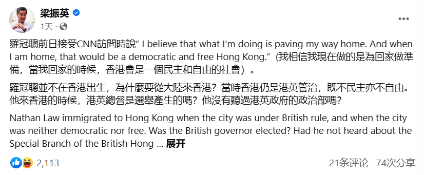 香港新聞網7月24日電 潛逃英國、被香港國安處懸紅100萬港元通緝的前“香港眾志”常委羅冠聰,近期屢屢在網上發帖賣慘,又妄圖美化自己出賣香港的“漢奸”行為。結果其一番“表演”被香港前特首梁振英揭了個乾淨! 羅冠聰日前接受美國有線電視新聞網(CNN)訪問時聲稱,“我相信我現在做的是為回家做準備,當我回家的時候,香港會是一個民主和自由的社會。”羅冠聰言論又是老套地給香港潑髒水,並試圖合理化自己反中亂港的行徑。 “羅冠聰並不在香港出生,當時香港仍是港英管治,既不民主也不自由,”就羅冠聰的一番“民主自由”說,梁振英在社交媒體發文向羅冠聰發出靈魂拷問:“為什麼要從大陸來香港?來香港的時候,港英總督是選舉產生的嗎?”